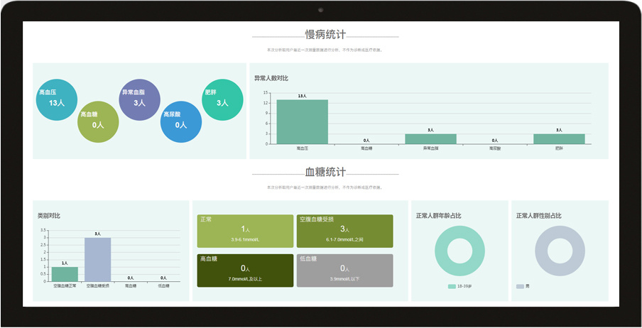 4、項(xiàng)目異常統(tǒng)計(jì)分析,包括高血壓、肥胖、高血脂、高血糖,對(duì)簽約居民血壓、血糖、血脂、體重?cái)?shù)據(jù)進(jìn)行分析,可查看各項(xiàng)目正常異常人數(shù),以便更好開(kāi)展健康促進(jìn)工作。