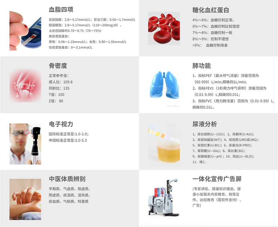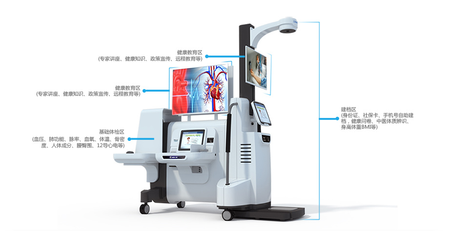 產(chǎn)品功能:自助建檔、電子問卷、遠程醫(yī)療、電子宣教、骨密度、肺功能、電子視力、尿液分析、血脂四項、