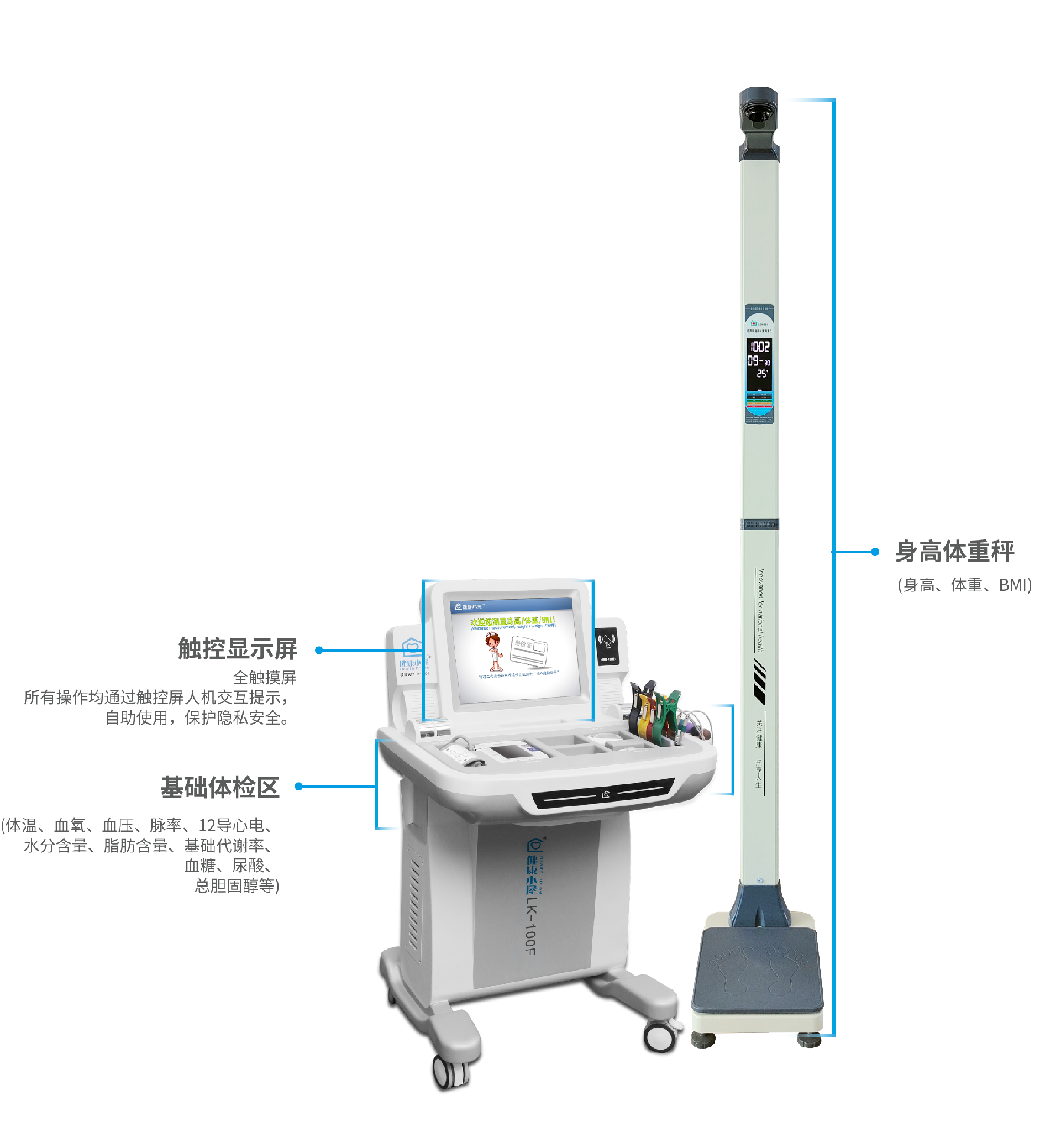 產(chǎn)品功能:身高、體重、BMI、體溫、血氧、血壓、脈率、12導(dǎo)心電、水分含量、脂肪含量、基礎(chǔ)代謝率、血糖、尿酸、