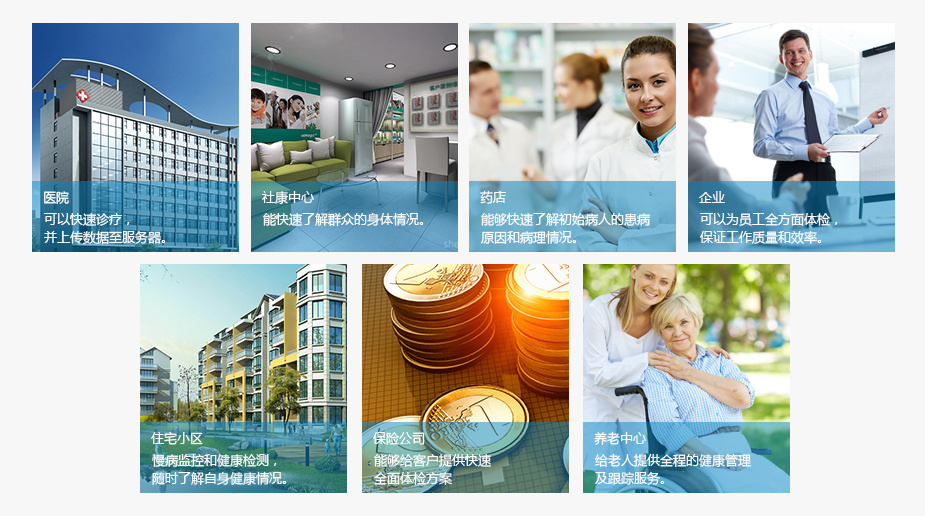 醫(yī)院(可以快速診療并上傳數(shù)據(jù)至服務(wù)器)、社康中心(能快速了解群眾的身體情況)、藥店(能夠快速了解初始病人的患病原因和病理情況)、企業(yè)(可以為員工全方面體檢,保證工作質(zhì)量和效率)、住宅小區(qū)(慢病監(jiān)控和健康檢查,隨時了解自身健康情況)、保險公司(能夠給客戶提供快速全面體檢方案)、養(yǎng)老中心(給老人提供全程的健康管理及跟蹤服務(wù))。